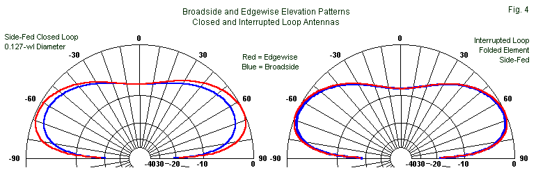 Fig. 4 compares the elevation plots of the side-side closed loop and the ILZX. In the configuration shown in Fig. 2, the ILZX shows a maximum edgewise gain of 0.05 dBi at 24 degrees. The maximum edgewise gain is -0.26 dBi at 25 degrees. The average gain of the two antennas is almost identical, while the ILZX exhibits a slightly more circular azimuth pattern. (With the ILZX fed at the bottom and the gap at the top, the resulting patterns are similar to those for the closed loop in the bottom-bottom configuration.)