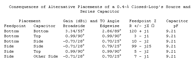 Let's assume that the terms "top," "bottom," and "side" have conventional meanings relative to the ground. We may place the feedpoint at any one of these positions. Likewise, we may place the series capacitor at any one of these positions. The following table shows what happens to the maximum gain, the elevation angle of maximum radiation, and the feedpoint impedance for various combinations. In all cases, the compensating series capacitor value remains constant and represents a reactance of -j2417 Ohms at 7.15 MHz. As well, the closed loop remain physically constant.