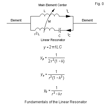 The equations are nearly but not quite self-explanatory. L and C, of course, are the values of inductance (of the wire length within the confines of the linear resonator) and of capacitance. The term r is the "turns-ratio" of the main or lower frequency element and the added linear resonator elements when treated as lumped components. Note that the diagram uses the term M to represent the mutual coupling between the main element and the linear resonator element. In contrast, the equations make use of a mathematically related concept, k, the coefficient of coupling. If we know the effective turns-ratio between the two wires, we can solve for r. Where we use the same diameter conductors for the element and the linear resonator, we end up with a 1:1 ratio for r, but that condition is rare in practice.