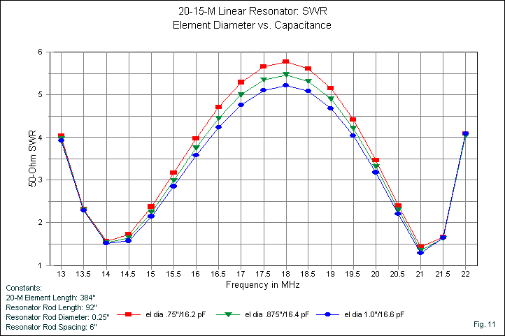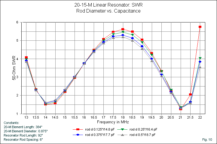 Altough the 0.125" rod is a bit difficult to tame, we may obtain essentially the same 15-meter performance with any diameter of resonator rod. In fact, the 15-meter performance--with only small changes in the required capacitance--shows almost identical feedpoint impedances and current phase angles at 21.225 MHz from 0.25" through 0.5", a 2:1 diameter ratio. In addition, the ratio of main element to resonator rod diameter changes considerably over the range of rod diameters. Fig. 10 shows the resulting wide-band SWR curves.