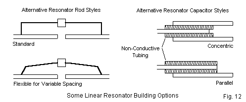 The right side of Fig. 12 shows two practical capacitors. The upper view shows concentric tubes (or a tube and a center rod) with a non-conductive sheathing on the center rod. The system offers maximum capacitance per inch due to the maximizing of facing surfaces. However, the system requires a mounting system for connection to the rod presumed to be at the right. The lower sketch shows paralleled rod lengths, with a non-conductive sheath on one rod. The system offers less capacitance per inch, but may be useful in fine-tuning. As well, the parallel capacitor does not require a physical connection between the capacitor leads and plates, since they are the same. Both systems require a means of securely fixing the final settings and perhaps heat-shrink tubing to protect against weathering effects.