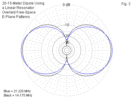 One popular statement about linear resonator dipoles is that we obtain essentially dipole patterns at both frequencies. The truth of this statement depends on the degree of precision upon which we might insist. In very loose terms, the statement is correct. However, as we lengthen a center-fed wire beyond 1/2 wavelength, the gain increases steadily, and the dual-band dipole with a linear resonator shows this increase. Fig. 3 overlays free-space patterns for the model at the two frequencies. We can clearly see the slightly higher gain and narrower beamwidth at the higher frequency.