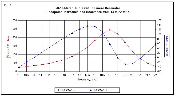 The initial model that I have just described is satisfactory for exploring some of the basic properties of a dual-band dipole for 20 and 15 meters when using a linear resonator. Perhaps foremost among the easily detectable properties is the impedance behavior. On 20 meters, the impedance will no longer be 72 Ohms, but about half that value. At 21.225 MHz, the feedpoint impedance may cover a wider range, depending on the specific values assigned to the physical variables. For the initial model, the impedance was about 60 Ohms.