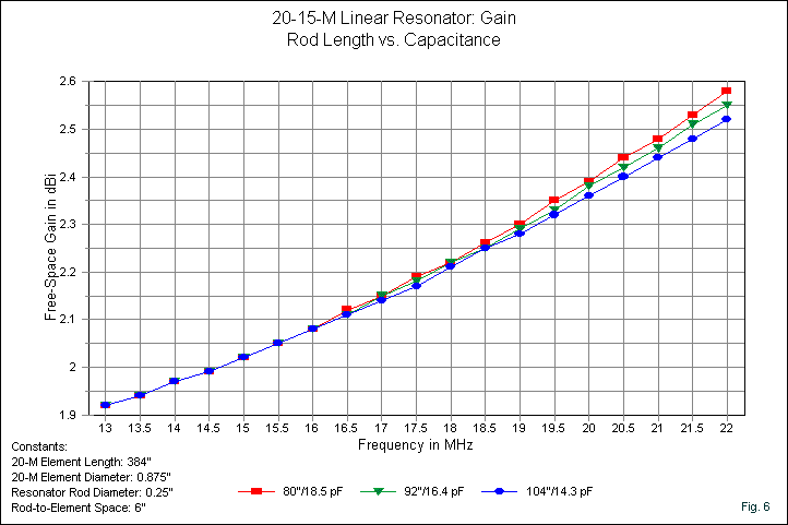 In many cases, the linear resonator rod would not by fully self-supporting. Instead, it would likely have a center non-conductive support extending between the main element and the rod. Some builders might use the support as a means of flexing the resonator rod at the center to either increase of decrease its distance from the main element. I have not modeled this situation, although the technique may serve as a method for fine tuning the assembly.