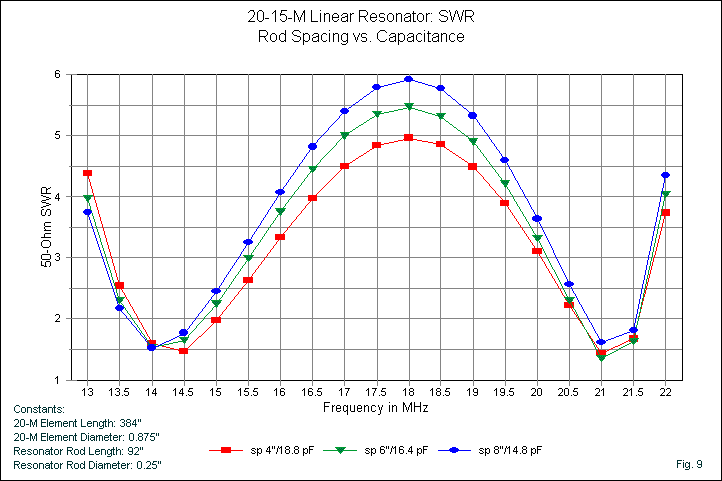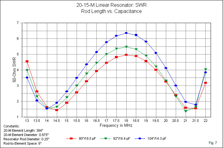 Perhaps the most significant changes occur with respect to the dipole feedpoint impedance. As shown in the table, the required linear resonator capacitance for acceptable SWR curves within 20 and 15 meters changes by about 0.35 pF per 2" change in resonator length. The rate of change is nearly linear. Fig. 7 shows the swept 50-Ohm SWR curve for 3 widely separate samples from the table.