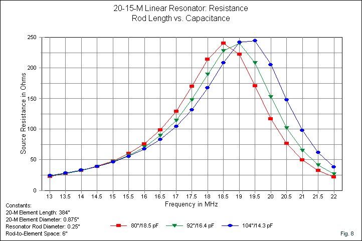 There is not much difference in the curves, although the shorter resonator rods show the lowest peak SWR value between the bands. However, far more significant to the builder are the SWR values within the bands of interest and the reasons for those values. The table shows that the 20-meter feedpoint impedance changes very little despite the 40% variation in rod length (once we readjust the capacitance). However, the 15-meter impedance changes considerably. Fig. 8 graphs the resistance variation for the same cases shown in the SWR graph.