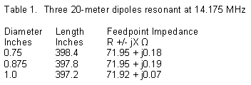 Although I have no magic method of determining the coefficient of coupling within a linear resonator circuit, it may be possible to evaluate which of the physical variables that go into such an antenna are most sensitive and which are least sensitive to changes. Modeling the simplest case, a 2-band dipole--may give us some useful clues should we wish to experiment with the idea. As a start, I picked an arbitrary frequency and dipole: 20 meters or, more specifically, 14.175 MHz. The dipole of choice is 0.875" in diameter. Because we shall later explore the effect of changing the main element diameter in a dual-band dipole, I also modeled dipoles using 1.0" and 0.75" diameter wire. Table 1 provides the data. I have purposely over-modeled the dipole to bring the resonant impedances as close together as feasible, noting the required change in dipole length to achieve this goal. Although the impedances match up to unrealistically small fractions, the length change between 0.75" and 1.0" material is over 1" or about 0.3% of the total length.