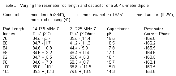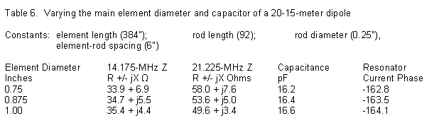 The changes in main element diameter yield only minuscule changes in the required capacitance and the resultant 15-meter resonator rod current phase. As we increase the element diameter, we find a rising 20-meter feedpoint resistance and a decreasing 15-meter feedpoint resistance. However, both changes are small. In general, a 1.3:1 change in main element diameter produces no performance change that rises above the level of construction and field testing variations that we are likely to encounter if we translate a model into a physical antenna.