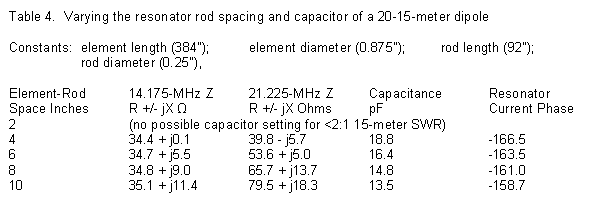 If we freeze the rod length at 92", we may vary one of the other dimensions of the physical structure. The initial model used a 6" space between the rod and the main element. Let's vary this spacing in 2" increments between 2" and 10" to see what emerges. The basic results of this exercise appear in Table 4. Remember that in this exercise, we are holding constant the main element length and diameter and the resonator rod length and diameter.