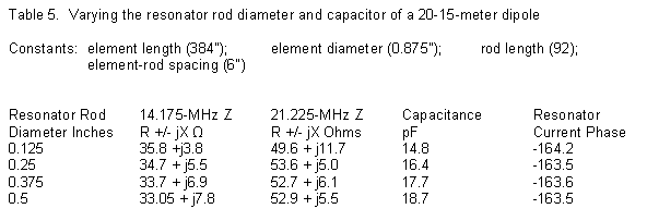 Changes in resonator rod length and spacing from the main element produce clear and significant differences in the impedance performance of the dual-band dipole. If we confine ourselves to practical building dimensions, other structural dimensions that we might vary produce less dramatic effects. Most builders who begin with a tubular structure for a 20-meter dipole would likely choose a smaller diameter for the linear resonator rod in order to hold the total element weight to the minimal practical level. That reasoning underlies the initial choice of a 0.25" diameter resonator rod. However, we might have as easily selected rods or tubes ranging from 1/8" to 1/2". Let's survey the sizes readily available in the U.S.. All the while we shall hold constant the main element length and diameter, and employ the 92" resonator rod spaced 6" from the main element. For our efforts, we obtain the results shown in Table 5.
