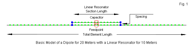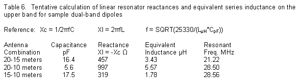 At this juncture, perhaps the only safe statement to make is that the linear-resonator structure--including the capacitor--modifies the current distribution along an element to yield a bi-directional pattern and a usable 50-Ohm feedpoint impedance on the upper band of operation. The structure is largely but not wholly inert at the lower frequency, as demonstrated by the required main element shortening relative to an independent lower-band dipole. Even with a 2:1 frequency ratio, the lower band resistance drops to 2/3 the value of an independent self-resonant dipole. With closer frequency ratios, the feedpoint resistance on the lower band drops to less than half the value of an independent dipole. The degree of main element shortening is too small relative to the impedance decrease to treat the center section as an inductive reactance similar to a center-loading coil.