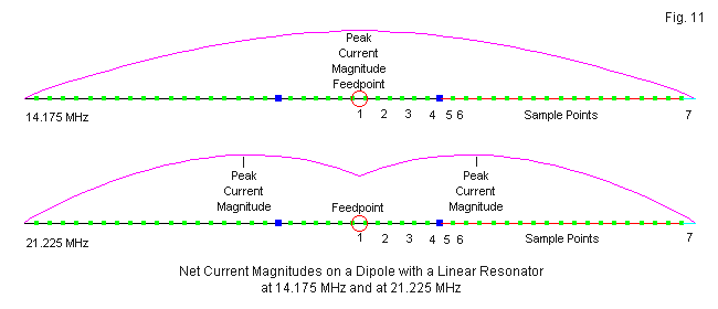 The separation of the center main-element currents from the resonator-rod currents without accounting for the phase angle of each on both bands creates a difficulty in visualizing the overall current distribution. Fig. 11 corrects the visualization by providing a single curve for the antenna for each of the two mid-band frequencies.