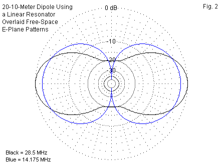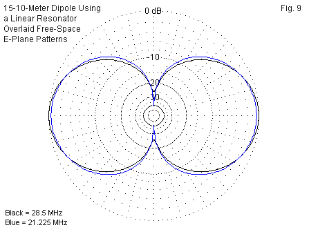 The smaller frequency ratio between the two operating frequencies also affects the radiation patterns. Fig. 9 overlays the 15- and 10-meter free-space E-plane patterns broadside to the resonator structure. Since at 10-meters the antenna is only a bit long as measured in wavelengths and compared to a standard 1/2 wavelength dipole, its gain and beamwidth do not vary much from the 15-meter pattern. As well, because the resonator structure is smaller, the side nulls are about 25 dB lower in gain than the main lobes. In the plane of the resonator structure and te main element, we find a 0.5-dB front-to-back ratio.