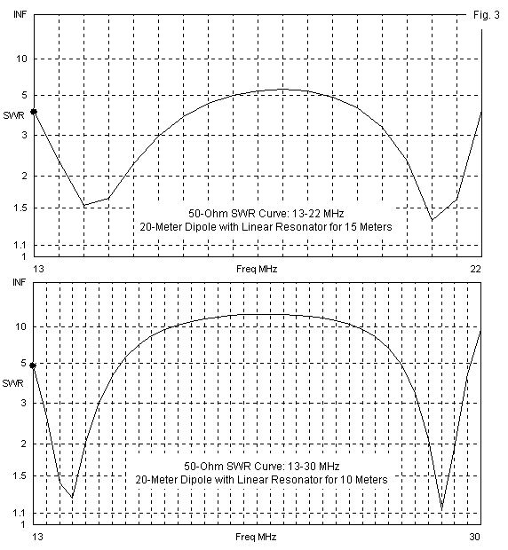 One popular notion about linear resonators is that they simply short out the center section of the dipole. If that assumption were true, then the leg ends should show more than a distant correlation to the length of a dipole at the upper frequency. In the 20-15-meter combination, the leg ends are 27" or 10% longer than a 15-meter dipole. Similarly, for the 15-10-meter combination, the leg ends are 19" or just under 10% longer than a 10-meter dipole. The most drastic difference occurs with the 20-10-meter combination where the leg ends are 84" longer than a 10-meter dipole, a 43% difference.
