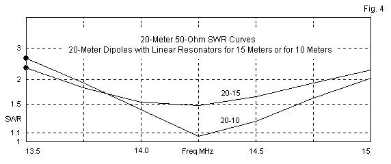 The 20-10 combination shows a lower minimum SWR value that stems from the higher value of the resistive component of the feedpoint impedance on the 20-meter band. The 20-15-meter combination exhibited a resistive impedance value of about 35 Ohms. The 20-10-meter combination has a resistive impedance of about 49 Ohms (consistently for all models in the group). Although this value is over 20 Ohms lower than an independent resonant 20-meter dipole, it does suggest a trend: the wider the frequency spread between the lower and upper frequencies of a linear-resonator dipole, the higher will be the lower-band resistive impedance. We shall have a chance to confirm this trend before we complete this part of our work.