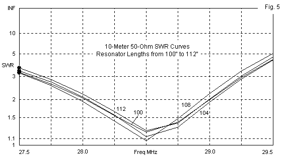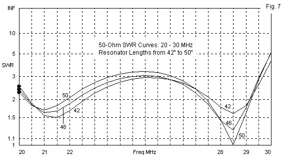 On 15 meters, the resistive impedance is down to 33-34 Ohms. However, as we lengthen the resonator rod, the resistance goes down and the inductive reactance goes up. Hence, we may expect somewhat less satisfactory 15-meter SWR curves with longer rods. In contrast, lengthening the resonator rod tends to raise the resistive impedance toward 50 Ohms on 10 meters, while reducing the capacitive reactance. As a result, longer rods produce somewhat better 10-meter SWR curves. Fig. 7 shows the contrasting trends in a wide bandwidth SWR curve set.