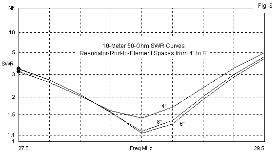 Fig. 6 shows the SWR curves for the center (6") spacing and for the extremes within the set (4" and 8"). Very close spacing limits the SWR bandwidth due to the lower resistive impedance (about 35 Ohms). However, as spacing increases, the rate of 10-meter impedance change slows considerably. Although the 6" spacing shows a marginal improvement over 8", both values are very close to the best that we may obtain.