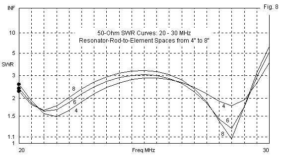 The table also shows that rate of impedance change on 10 meters decreases as we increase the spacing of the rod from the main element. This is one of the results that appears to be consistent for all of our models. It suggests that in experimenting with linear resonators, we should not be too anxious to form a very compact element and resonator structure. A little extra spacing may result in easier final adjustments. Fig. 8 shows the SWR curves for the extremes and the middle of the spacing range.