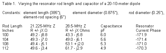 The 20-10-meter dipole uses a 385" long 0.875" diameter main element. The initial placement of the 0.25" diameter resonator rod is 6" from the main element (measured center-to-center). Within these fixed dimensions, we may use rod length from about 100" to 112" and obtain usable results on 10 meters. Since 10 meters is a very wide HF band, I have let the first MHz of the band (28.0 to 29.0 MHz) serve as the spread for which we shall want to have less than 2:1 50-Ohm SWR. Table 1 shows the modeling results for changes on resonator rod length in 4" increments.