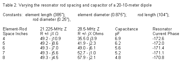 Let's select the 104" resonator rod as a prime candidate. As well, we shall retain the 385" long, 0.875" diameter main element, along with the 0.25" diameter resonator rod. With these constant, we may vary the spacing between the rod and the main element in appropriate increments to see what happens to the performance and to the required capacitance for our desired SWR bandwidth. Since 10-meter is a higher frequency than 15 meters, we shall vary the spacing in 1" increments. Table 2 shows the results of these modeling experiments.