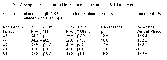 Since I have fixed the main element, you may assume that the experimental models were successful in obtaining resonance on both 15 and 10 meters (21.225 and 28.5 MHz). The initial resonator rod for tuning to 10 meters used the same 0.25" diameter material and the same 6" spacing that we have used throughout these trials. The next question then is what length must we use for the resonator--and what value of tuning capacitor? Table 3 shows a range of rod lengths between 42" and 50" and associated capacitor values.