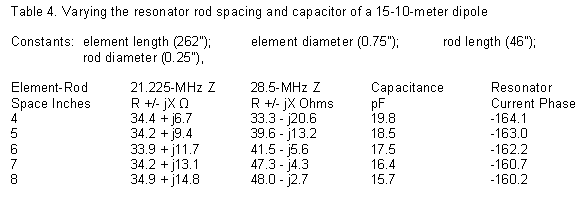 Let's use the 46" long resonator rod and vary its spacing from the main element from 4" to 8" (the same spacing range used for the 20-10-meter combination). We shall discover that the 15-meter impedance varies only slightly across this range, as shown in Table 4.