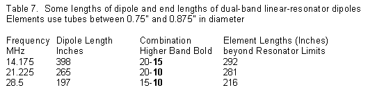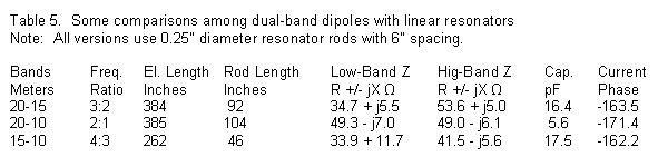 We have explored three different dual-band combination dipoles using linear resonators: a 20-15-meter version, a 20-10-meter combination, and finally a 15-10-meter antenna. All three antennas provide 2-band dipole service with adequate 50-Ohm SWR bandwidths for the selected operating frequencies. The main elements are all tubular, using 0.875" diameter material for basic 20-meter operation and 0.75" diameter material for basic 15-meter service. However, in many respects the three antennas have significant differences. Table 5 shows some of those differences, using mid-range models from each group.