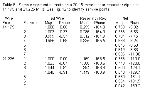 We can obtain a set of approximate values for each segment by taking the vector sum of the currents and their phase angles at each corresponding segment within the center section of the antenna. The calculated net values will only be approximate because they do not account for the connecting wire between the main element and the resonator rod. However, they will be close enough to provide smoothed curves, such as those shown in Fig. 11. Table 8 provides a sample of the calculations for the two frequencies. The sample points refer to the numbered segments in Fig. 11. Points 5 and 6 are the first two segments on the common end wire. Point 7 is the end segment to establish the approximate total phase change along the wire. The values for sample 7 in both cases yield total phase changes that closely correlate with a single wire of the same length as the linear-resonator dipole when used at each frequency.