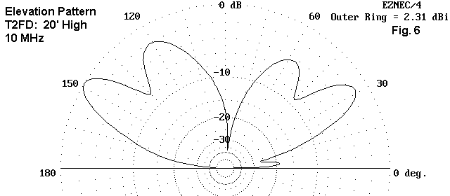 Fig. 5 shows the elevation pattern of the standard vertical configuration T2FD (as cut for a 2 MHz lower limit or a length of 165') at 5 MHz. The low angle of radiation is one of the features of the T2FD that make it appealing in certain applications. The antenna remains 20' above average earth at the lower end. Note that the pattern is not symmetrical when taken across the plane of the wires (with a 5' separation), with slightly less gain in the direction of the loaded wire. In general, the closer the wire spacing, the less the gain differential. Broadside to the plane of the wires, the elevation pattern would be symmetrical with a gain intermediate to the high and low values shown in this edgewise view.