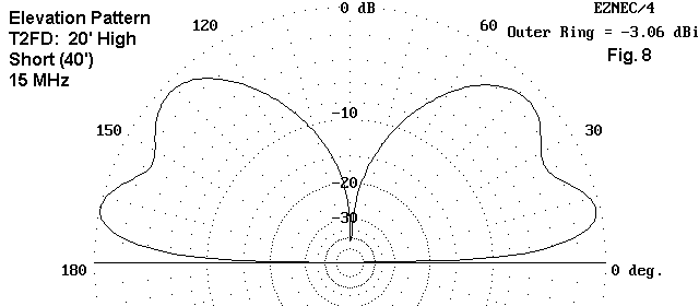 Fig. 8 shows the elevation pattern of the second T2FD at 15 MHz, for comparison with the pattern for the long T2FD in Fig. 7. Although the peak gain value is lower with the shorter antenna, the radiation is at an angle of greater utility in most applications.