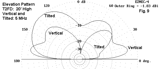 Fig. 9 shows the two patterns. The vertically oriented T2FD shows minimal pattern displacement from one direction to the other. However, the tilted version shows a heavy pattern displacement, but in neither direction is the radiation field as strong as at the peak of the lowest lobe of the vertical version.