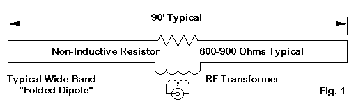 Locating a non-inductive resistor of sufficient power dissipation is likely to be the chief problem for WBFD builders who intend to transmit with the antenna. Unless you can find a suitable resistor at one of the surplus outlets, purchasing an antenna may prove economical in the long run, if we add both cost and parts-searching time together. Any value in the 800-900 Ohm range--or even "thereabouts," if a bargain appears--will serve.