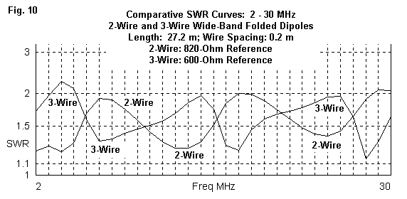 The cost for the small increase in gain is a wider fluctuation in the impedance about a central impedance value. The reactance tends to be somewhat higher than for the 2-wire WBFD. Fig. 10 shows the comparative SWR curves for the two antennas, with each one using its own reference value: 820 Ohms for the 2-wire version and 600 Ohms for the 3-wire version.