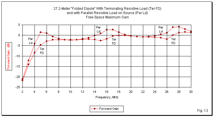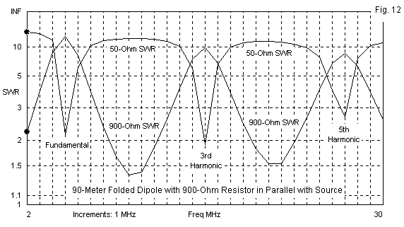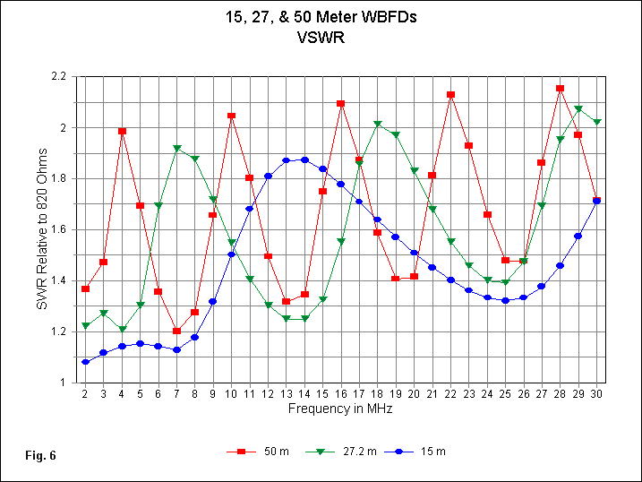 Fig. 12 provides a set of SWR curves across the 2-30-MHz span that we have used in the examination of the true WBFD. Since the increment between readings is 1 MHz, the 50-Ohm curves do not necessarily show the best SWR values possible. However, the 3 SWR minimum points show that the antenna acts completely normally when treated as a center-fed doublet. The 3 low 50-Ohm SWR values occur at the fundamental, the 3rd harmonic, and the 5th harmonic frequencies for the wire.