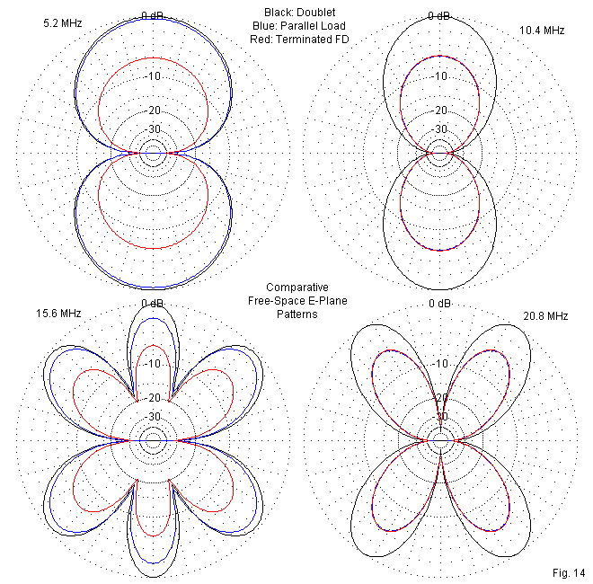 The dominant problem with the faux WBFD is the changing feedpoint requirement as we alter the frequency of operation. A direct coaxial feed is applicable in only 3 narrow frequency regions of the spectrum. Likewise, the 16:1 balun treatment shows equally limited application. Given the feeding limitations, one might well use a simple center-fed doublet with a parallel feedline and a wide-range antenna tuner. Fig. 14 overlays free-space E-plane (azimuth) patterns for 5.2, 10.4, 15.6, and 20.8 MHz to provide a better performance comparison among the doublet, the WBFD, and the faux WBFD.