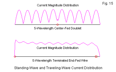 The lower portion of Fig. 15 shows the current distribution along a terminated end-fed long-wire, one of the simplest traveling-wave antennas. Since we have a terminating impedance, the ideal situation would show a constant current magnitude all along the wire. The termination impedance prevents the return of energy necessary to create stading waves. For a variety of reasons, terminated wires fail to achieve a perfect traveling-wave status. The termination is normally and for highly practical reasons a non-inductive resistor. However, the required impedance turns out to be both complex and finicky. So we only approximate a traveling wave, a basic current level with superimposed standing waves that are small but detectable. (The example shown uses a technique for setting up a traveling-wave long wire described by E. A. Laport in Radio Antenna Engineering, pp. 55-58, 301-339 (1950).)