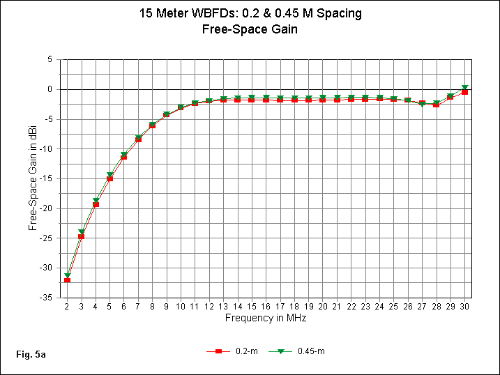 One question posed by various recommended wire spacings in past literature is whether wire spacing makes a difference to performance. Fig. 5a provides something of an answer as it compares the gain values for models of a 15-meter long version in 0.2-m and 0.45-m spacing. The gain values are insignificantly different, ranging from 0.2 to 0.4 dB.