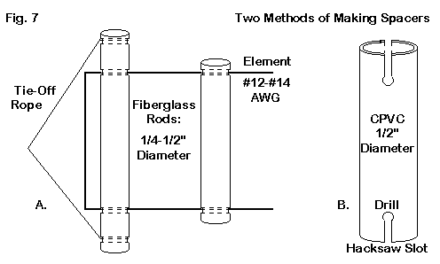 Fig. 7 shows just 2 of many ways to space the wires along their length. In the 1930s, we might have used wood dowels boiled in paraffin. Today, we have access to a variety of better materials. Part A of the sketches shows fiberglass rods, with holes drilled to pass the size wire we decide to use. #12 to #14 AWG copper wire (0.06-0.08" or 1.5-2.0 mm) is likely to be the most common choice. The end post can be longer to hold tie-off ropes for the assembly. Fiberglass rods can be purchased from mail order sources. However, local home improvement centers often carry adaptable materials. For example, I recently spotted some 1/2" diameter fiberglass rod under the guise of chimney flue brush extension handles.