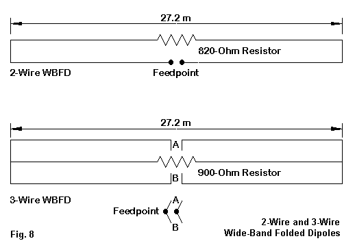 The sketch shows a 900-Ohm resistor in parallel with the feedpoint of the 27.2-m antenna. The SWR curve that accompanies the sketch reveals a property that is unlike the true WBFD antenna: a resonant feedpoint at about 5.2 MHz. The actual reported resonant impedance is about 63 Ohms. The parallel combination of 900 Ohms (the resistor) and 70 Ohms (the typical resonant dipole resistance) is about 65 Ohms.