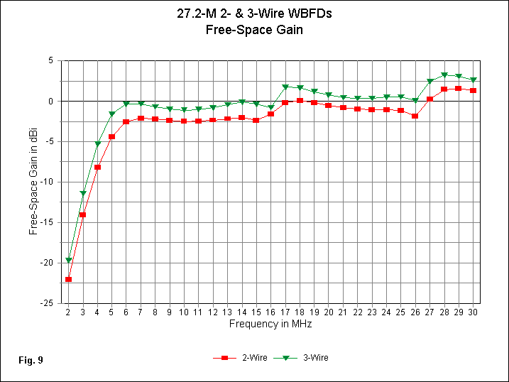 In general, the 3-wire version of the WBFD is capable of about 1-3 dB (depending upon frequency) gain advantage over the 2-wire version. The following brief table provides a glimpse at the fluctuations for the 27.2-m antennas. All gain values are for free-space.