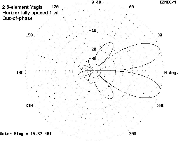 And that is using only 3-element Yagis as the foundation. There is no reason to believe that results for larger individual beams cannot be extrapolated with reasonable reliability--or that 5/8 wl spacing will not show similar small gains above 1/2 wl spacing. In the latter case, however, phase reversal patterns might differ, since beam interaction differs a bit.