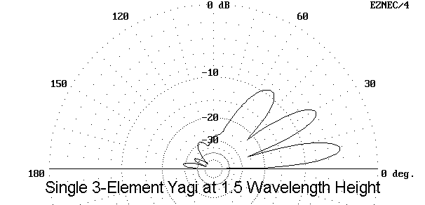 This configuration shows lesser lobes at 7 degrees (down 4 dB) and at 28 degrees (down 3.5 dB). The feedpoint impedance is acceptable. The configuration may be useful as an alternative dx configuration, despite the loss of gain from in-phase maximum, since--under some circumstances-- capturing the proper elevation of signal angle may be more important than raw gain.