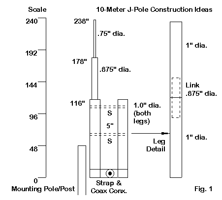 The J-pole's disadvantage--especially on 10 meters--is that it is a considerable structure. The version we shall examine is 20' tall. However, it does not have much side-to-side dimension. Like all vertical antennas, we should install it as far away from houses, trees, and shrubbery as our home site makes feasible. How high we should place the base of the antenna is a question that we shall look at before we are done.