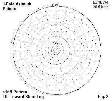 The J-pole pattern is omni-directional, with only a very small offset created by the double-leg matching section. Fig. 2 shows a typical azimuth pattern, along with the very small offset in the direction of the open-end leg of the matching section. The offset cannot be detected in operation.