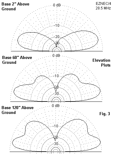 Fig. 3 gives us the answer. With the antenna close to ground, we obtain a single-lobe elevation pattern about 1 dB (hardly detectable) weaker than more elevated base positions. The antenna will be about 20' tall overall, and most installations would opt for this height as the simplest mechanically.