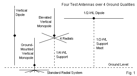 To see why verticals have once more become popular on or near salt water, let's perform a little exercise. Since I cannot afford a Caribbean vacation at the moment, we shall have to use modeling software. We shall look at four antennas, all simple ones, as shown in Fig. 1. The first is a center-fed vertical dipole with its bottom end 1' above ground. The second is a ground-mounted vertical monopole. The third antenna is simply the monopole raised ¼ wavelength above ground with 4 elevated radials. Finally comes the horizontal dipole that is ½ wavelength above ground.