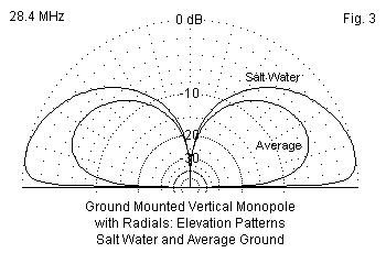The shorter monopole is less effective than the vertical dipole, with higher elevation angles to accompany the lower gain. Fig. 3 again contrasts just the salt-water pattern with the pattern over average soil. The overall height of the lobes, regardless of soil quality, is immediately apparent. Ground-mounted vertical monopoles find almost no land use on 10 meters, although they are common on ships and buoys.