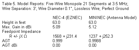 We have enough data to let us try a five-wire model in each system using the wider spacing and the reduced overall segmentation. The five-wire model will be shorter than the two-wire model, so the vertical wires will use 21 segments each. Table 5 provides the output reports.