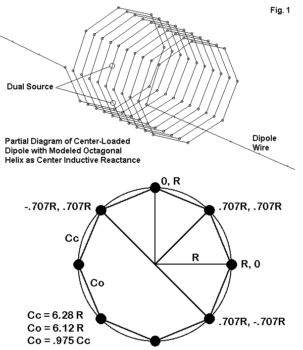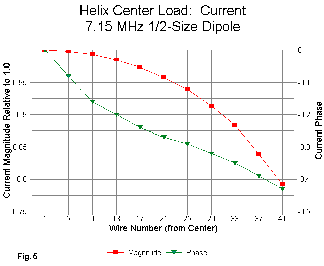 The current magnitude differential between the source and the coil end is approximately 20% of the maximum value. Since the inductance of a helix is in theory predicated upon equal current magnitudes at both ends of the coil, the differential currents dictate that in part the indictor does not act solely as an inductor. The physical model of the center load provides indications that the helix also radiates in the manner of any length of wire included within the total length of the dipole--in terms of gain over the Type 0 load, the vertical radiation field, and the reduction in the required inductance to effect loading to resonance.