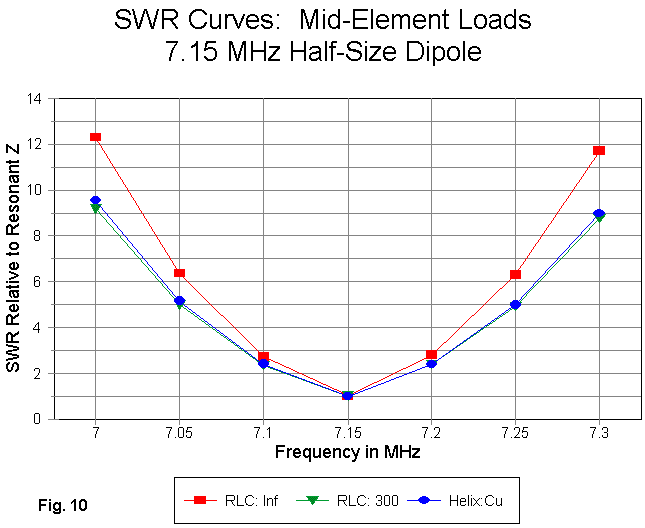 Although the physically modeled center loaded antenna showed a steeper SWR curve than its Type 0 counterpart, the mid-element loaded antennas show a good correspondence between mathematical and physical loads. In fact, as shown in Fig. 10, the mid-element physical helices correspond nicely to mathematical loads with a Q of 300. This curve corresponds reasonably well with estimates for the Q of the coil at or just below 300, based upon reductions from the calculated Q of over 400 that presumed an ideal wire diameter to spacing ratio. The resonant source impedance of about 24.6 Ohms is a bit lower than the Type 0 model at Q=300, where the source impedance was about 31.9 Ohms.